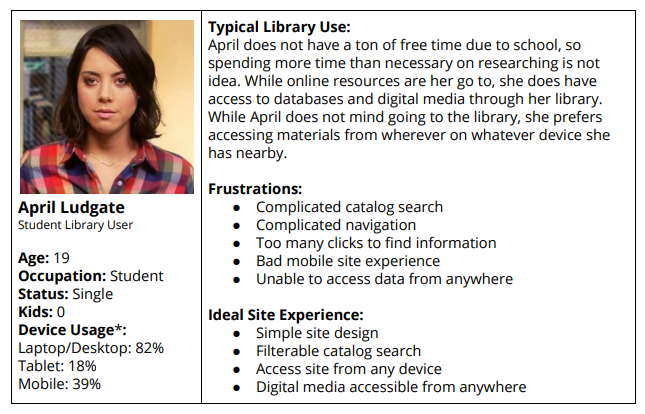 Based on the research I was able to create three personas based on the typical library users. Of the three, the primary persona is the general library user who represents a majority of library users and should be considered first for any user experience questions.